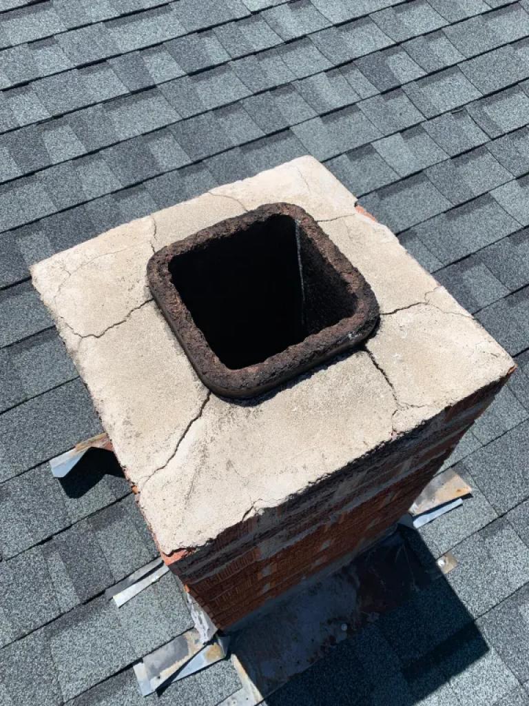 Right away the missing cap stood out. However there were other issues more important to the customer. The cracked crown and rusty flashing became the priorities and we quickly jumped into action.