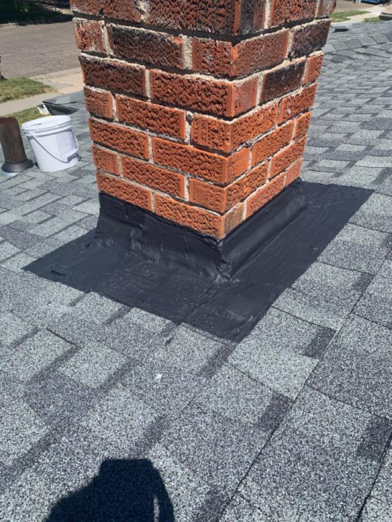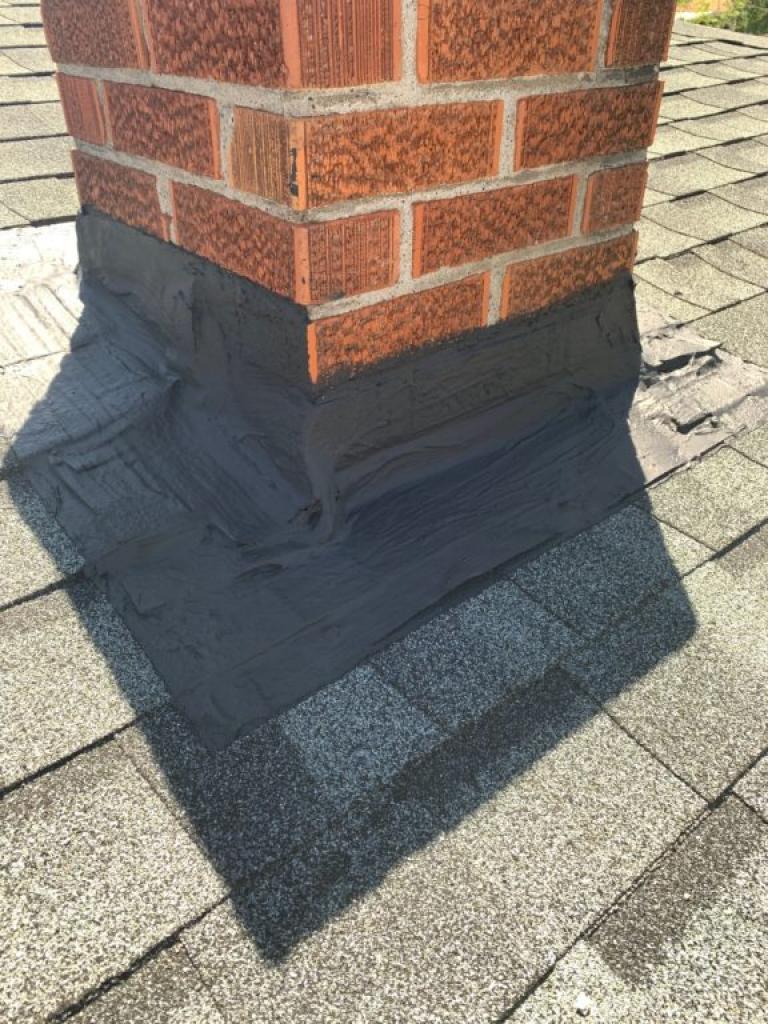 Chimney Saver Crown Coat is an excellent short-term crown repair. It prevents water entry through existing cracks in the crown while also bridging any new ones that form. We also used Chimney Saver Flashing Seal around the base of the chimney to seal the flashing in a water-tight rubber boot. The flashing seal frequently needs to extend six inches or more onto the shingles. This is because the flashing around the chimney extends out beneath the shingles and if it is rusty as well, the flashing may still leak.